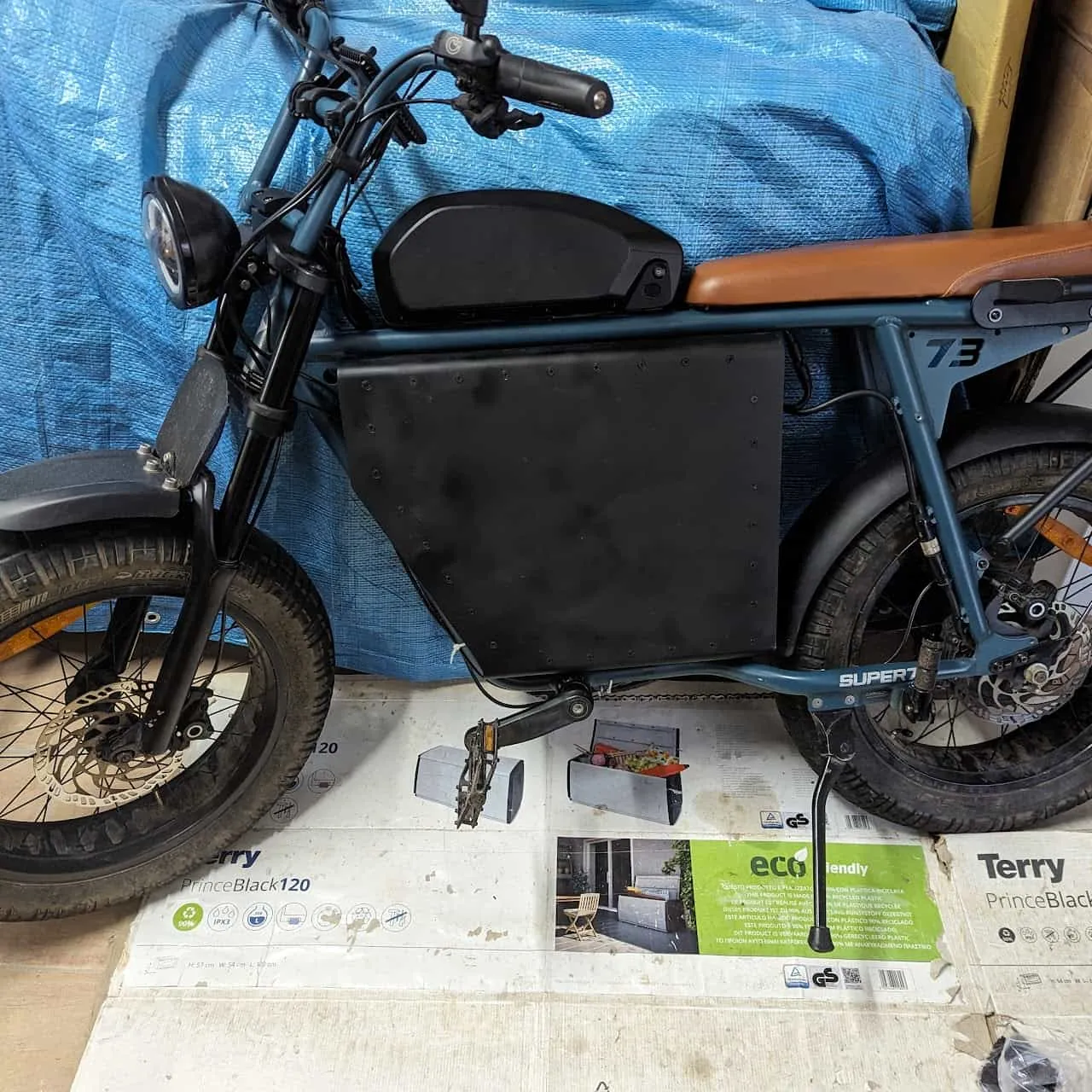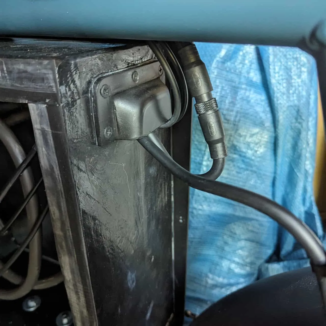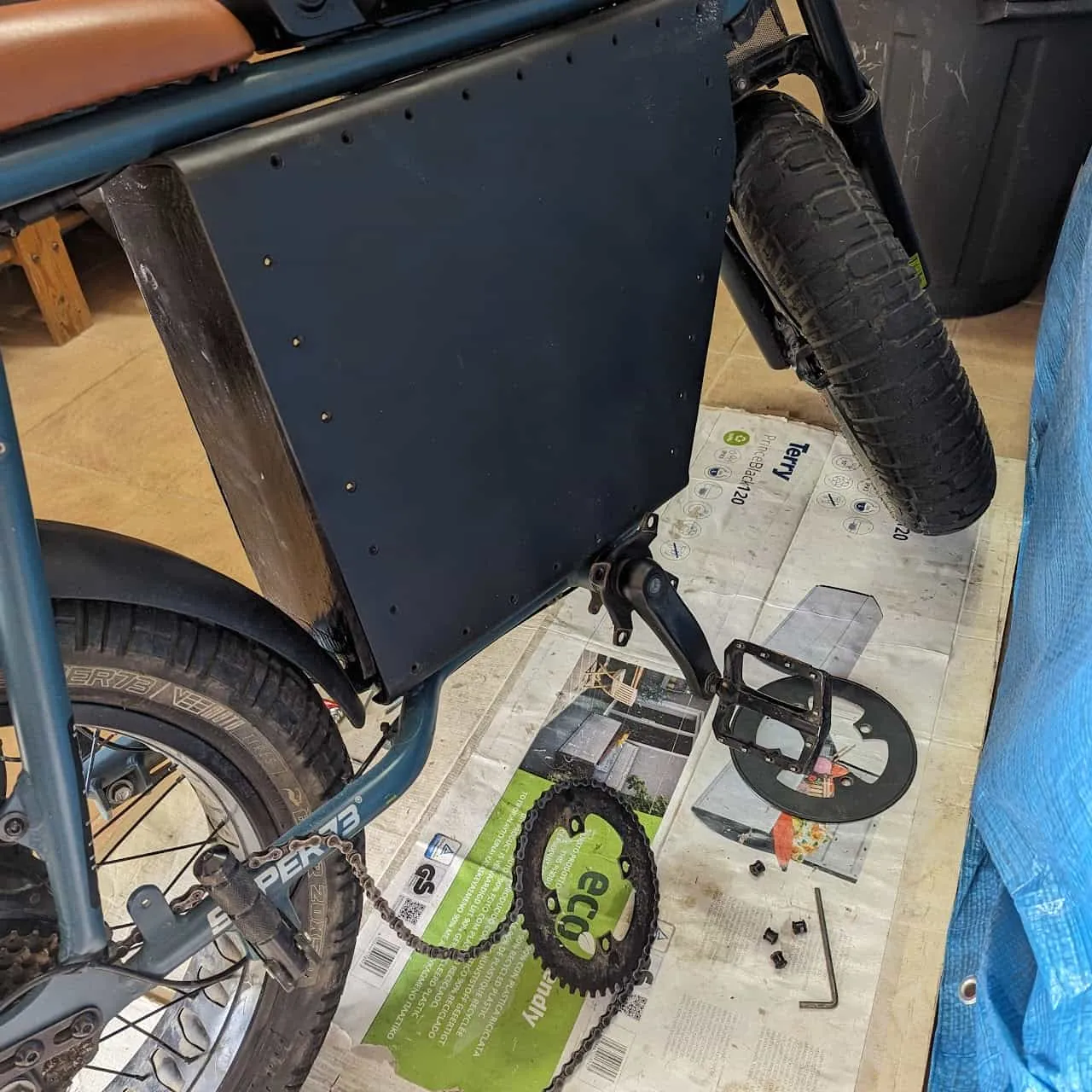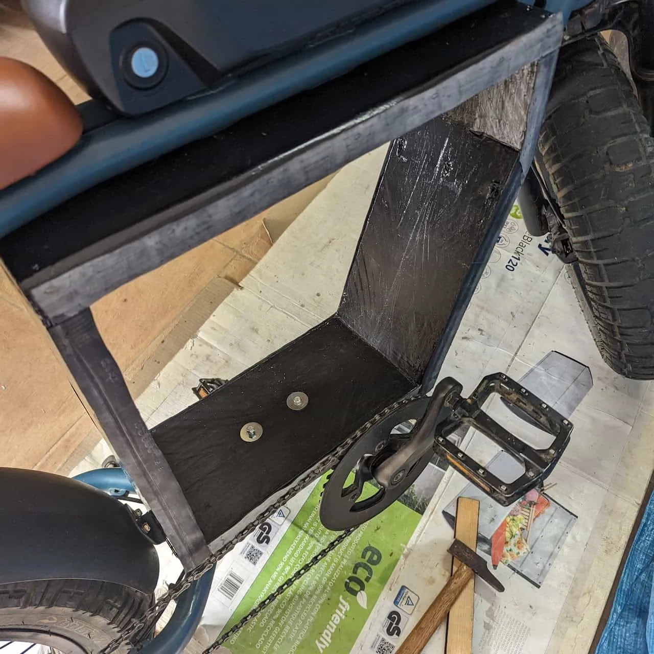 - Mount the side panels. Mine are mounted with black woodscrews all around the frame roughly 5cm apart. If waterproofing is a concern for you now is the time to add some rubber to the edges of the frame, that the panels will squish. I cut strips out of an old tire tube but you could use something off-the-shelf or silicone. Keep in mind you will probably take the no-chain side panel on and off a few times since it is the most practical one, the other one can be made permanent.