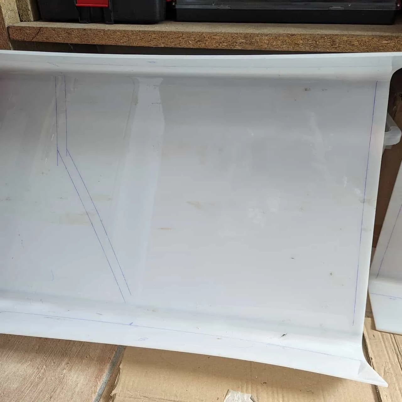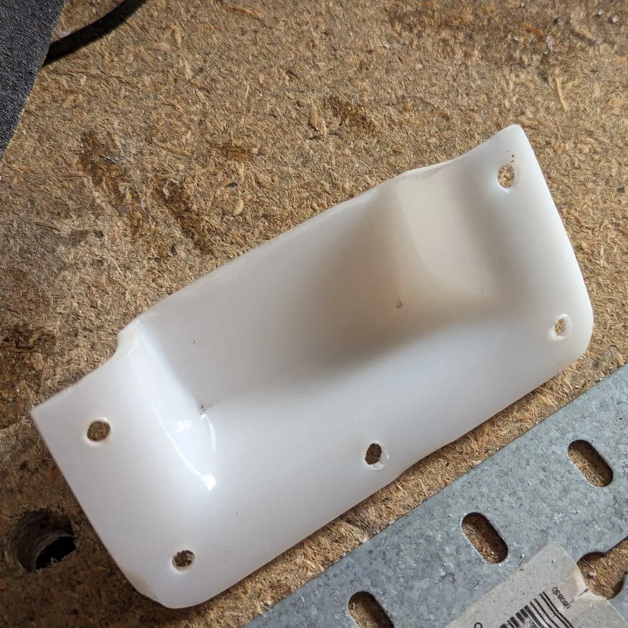 Section titled “Air vent / Cable hole”Since my setup is used to fit a controler-battery combo I needed a hole to pass the cables. Something that would be rain and splash resistant. So I bent and shaped a piece of acrylic to cover a hole in the upper back of the frame.