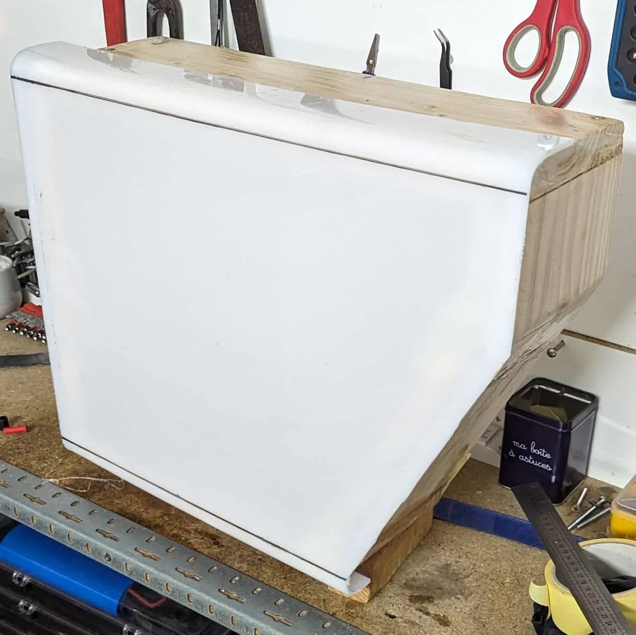 Cut and assemble the wood frame as detailed above, test fitting and adjusting during the whole process. On each joint, use a LOT of glue as well as 2-3 wood screws. This is to make them sturdy and waterproof. I suggest starting with the bottom piece and then the back and top since they are 90-degree angles. Once these three are assembled and test-fitted you can take proper measurements for the front diagonal which is the trickier part.